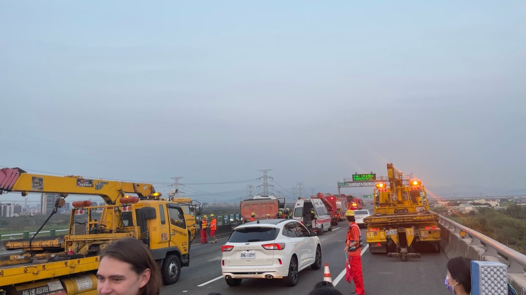 After about an hour on the freeway (and after six tow trucks passed us to the crashed truck), a huge tow truck came. Everyone got back on the bus. The tow truck started moving, pulling the bus behind it.